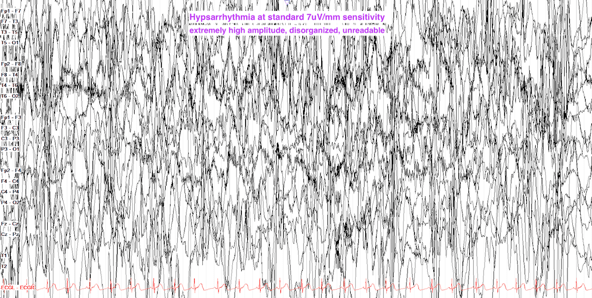 Hypsarrhythmia (“hyps” means mountainous) is a very high voltage (usually >500μV), disorganized pattern first termed by Gibbs in the 1950’s. The EEG is irregular, asynchronous, with a delta slow wave pattern and multifocal spikes. The chaotic high-amplitude slow-wave activity may be intermittently replaced by a relatively low-amplitude pattern or partial flattening that lasts a few seconds. This concerning pattern commonly occurs in infants before the age of 1 year with infantile spasms (Salaam Spasms), or West Syndrome. Infantile spasms (IS) consist of a jackknife flexion movement at the waist with myoclonus involving the arms or head. The spasms begin suddenly, often at the onset of sleep, upon awakening or feeding, and often in clusters lasting 10-20 minutes. Urgent treatment is critical to prevent long term developmental delays and intractable seizures.